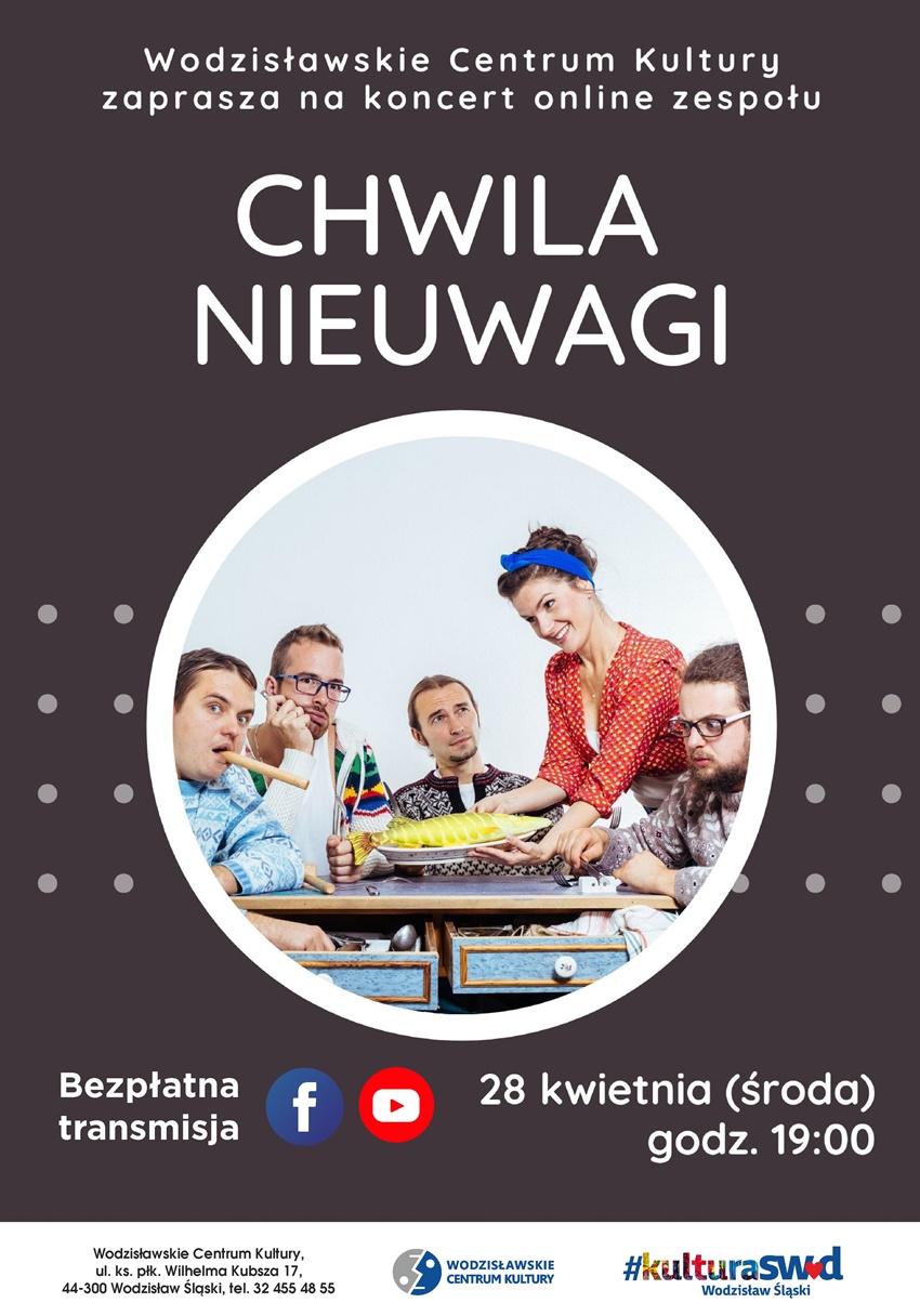 Folk, jazz i poezja – ten zespół łączy te wszystkie nurty, konsekwentnie tworząc własny, niepowtarzalny styl. Mowa o zespole Chwila Nieuwagi, który już 28 kwietnia o 19:00 będzie gościł na Waszych ekranach.