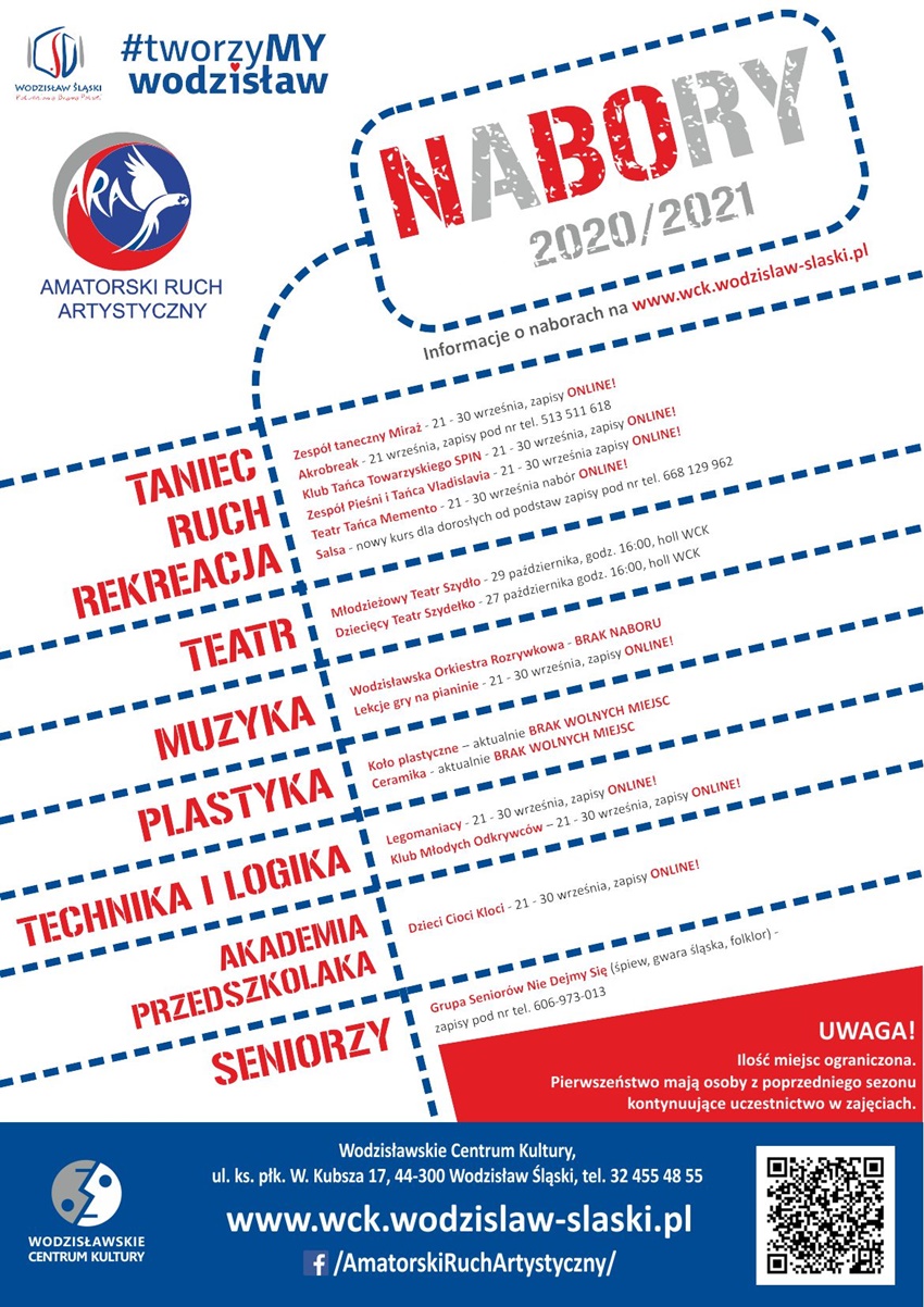 Szczegółowe informacje odnośnie formy zapisu i terminów naboru oraz instrukcja zapisu dostępne są na stronie Wodzisławskiego Centrum Kultury.