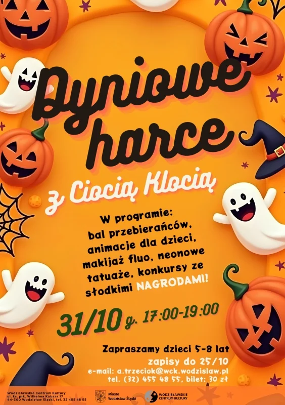 Wodzisławskie Centrum Kultury wraz z Ciocią Klocią serdecznie zapraszają na „Dyniowe harce”! Kiedy? Już w czwartek, 31 października. Zatem jeśli szukacie ciekawego, a razem wystrzałowego pomysłu na jesienną imprezę dla dzieci, to ta propozycja przypadnie Wam do gustu. Będzie wesoło i kreatywnie, a na uczestników czekać będzie moc atrakcji!