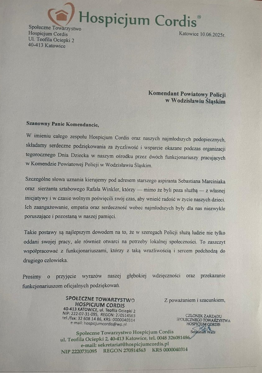 Komendant Powiatowy Policji w Wodzisławiu Śląskim otrzymał podziękowania dla mundurowychz Wydziału Prewencji. Policjanci, w czasie wolnym od służby, odwiedzili podopiecznych katowickiego hospicjum, które opiekuje się dziećmi i dorosłymi cierpiącymi na choroby nowotworowe oraz inne przewlekłe schorzenia. Publikujemy treść otrzymanych podziękowań.