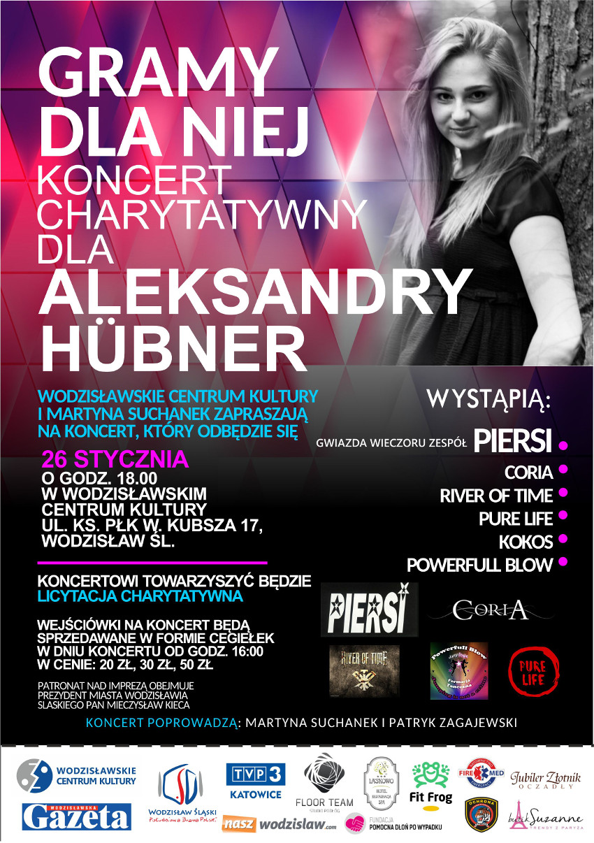 Wodzisławskie Centrum Kultury i Martyna Suchanek zapraszają na Koncert Charytatywny na rzecz Aleksandry Hübner, dwudziestojednolatki, która w listopadzie zeszłego roku uległa wypadkowi na torze kartingowym w Zwardoniu