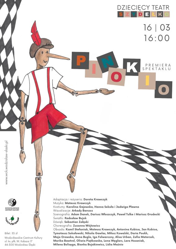 Piękna inscenizacja wszystkim dobrzej znanej historii o drewnianym pajacyku Pinokiu w marcu zagości w repertuarze Wodzisławskiego Centrum Kultury. Ta wzruszająca historia o dorastaniu, zdobywaniu życiowego doświadczenia, sile prawdy i miłości przypadnie do gustu zarówno dorosłym jak i małym widzom. Pełne barwnych postaci takich jak wróżka, świerszcz Filip, lis, kot, robaczek świętojańskich, przebiegłe kuny, Dżepetto czy dyrektor Wielkiego Teatru Marionetek przedstawienie okraszone pięknymi kostiumami, wizualizacjami, muzyką w kompozycji Mateusza Krawczyka, scenografią z pewnością na długo pozostanie w pamięci widzów.