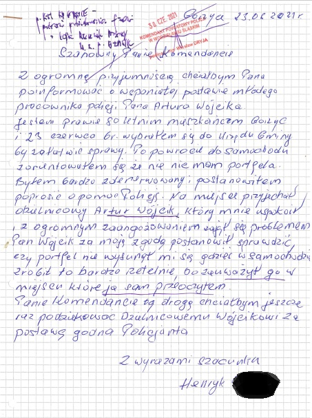 Z ogromną przyjemnością chciałbym Pana poinformować o wspaniałej postawie młodego pracownika Policji Pana Artura Wójcika. Jestem prawie 80 letnim mieszkańcem Gorzyc i 23 czerwca br. wybrałem się do Urzędu Gminy by załatwić sprawy. Po powrocie do samochodu zorientowałem się że nie mam portfela. Byłem bardzo zdenerwowany i postanowiłem poprosić o pomoc Policję. Na miejsce przyjechał dzielnicowy Artur Wójcik, który mnie uspokoił i z ogromnym zaangażowaniem zajął się problemem. Pan Wójcik za moją zgodą postanowił sprawdzić czy portfel nie wysunął mi się gdzieś w samochodzie. Zrobił to bardzo rzetelnie bo zauważył go w miejscu które ja sam przeoczyłem. Panie Komendancie tą drogą chciałbym jeszcze raz podziękować dzielnicowymu Wójcikowi za postawę godną policjanta.