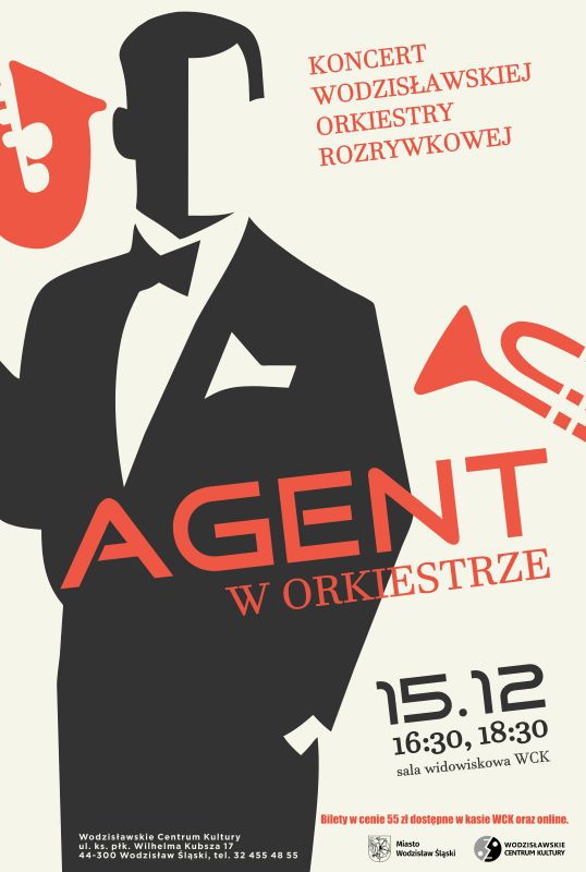 - godz. 16:30, 18:30 – Występ Wodzisławskiej Orkiestry Rozrywkowej “Agent w orkiestrze” – koncert muzyki filmowej, bilet: 55 zł WCK, sala widowiskowa