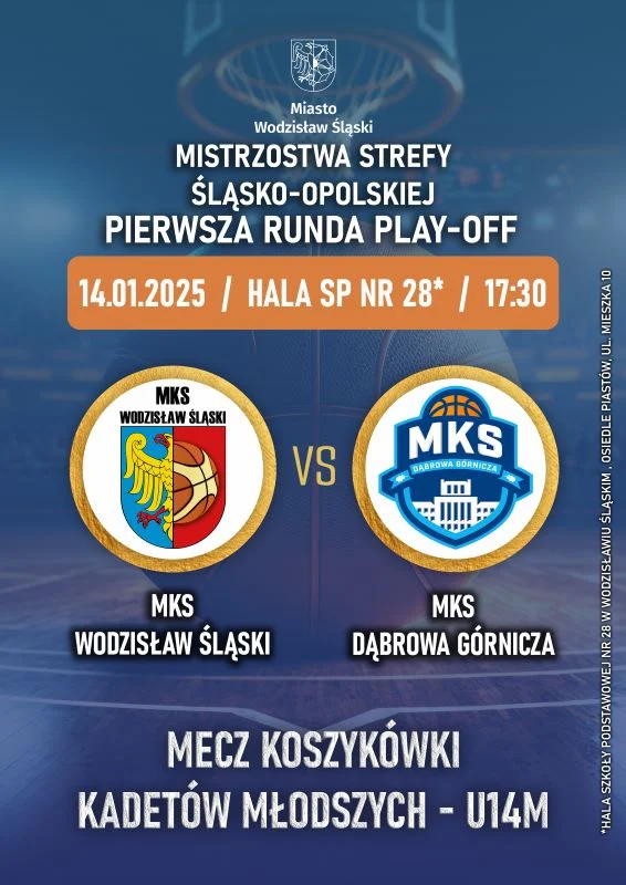 Mecz odbędzie się 14.01.2025 r. (wtorek) o godzinie 17:30 w hali sportowej SP28 Wodzisław Śląski (ul. Mieszka 10).