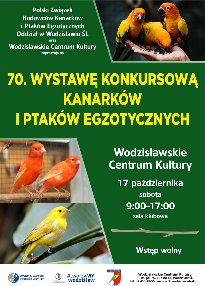 Wystawa odbędzie się w sali klubowej Wodzisławskiego Centrum Kultury w sobotę, 17 października, w godzinach 9:00-17:00. Podczas wydarzenia będzie można zobaczyć 30 kolekcji kanarków różnych ras, w tym kanarków kolorowych i kształtnych, a także papugi z kilku kontynentów. Pojawią się papugi duże: Piona, Amazonka, Księżniczka Walii, Szkarłatka czy mniejsze Łąkówki wspaniałe. Nie zabraknie też małej egzotyki: różnych gatunków Amadyny, w tym Amadyny wspaniałej (wystawowej). Do konkursu zostały zgłoszone również dwie hybrydy kanarka. W kąciku giełdowym będzie można zakupić wybrane okazy. Wstęp na wystawę jest bezpłatny.