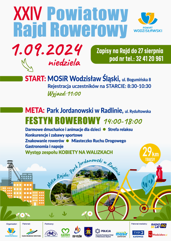 Impreza ma charakter typowo turystyczny, co oznacza, że przejazd będzie odbywał się w tempie rekreacyjnym. Trasa Rajdu prowadzić będzie z Wodzisławia Śląskiego do Radlina – przez Turzę Śląską, Wodzisław Śląski (Wilchwy), Marklowice (Grodzisko, Marklowice Dolne, Chałupki), Radlin (Obszary, Marcel, Biertułtowy, Głożyny, Reden). Meta rajdu usytuowana będzie w Parku Jordanowskim w Radlinie przy ul. Rydułtowskiej. Łącznie długość trasy wynosi 29 km. Start imprezy nastąpi z parkingu MOSiR Centrum w Wodzisławiu Śląskim (ul. Bogumińska 8). Zbiórka uczestników rozpocznie się od 8:30, a start przewidziany jest na godzinę 11:00. Tradycyjnie już, w trakcie rajdu przewidziano trzy postoje. Na mecie Rajdu na uczestników, ale także na wszystkich tych, którzy odwiedzą w niedzielę Park Jordanowski czeka wiele atrakcji. Od 14:00 w Parku rozpocznie się Piknik Rowerowy. W ramach imprezy odbędą się konkurencje sportowe z nagrodami, animacje dla dzieci, występy artystyczne i koncerty muzyczne. Podczas festynu będzie też można korzystać z darmowych dmuchańców dla dzieci.