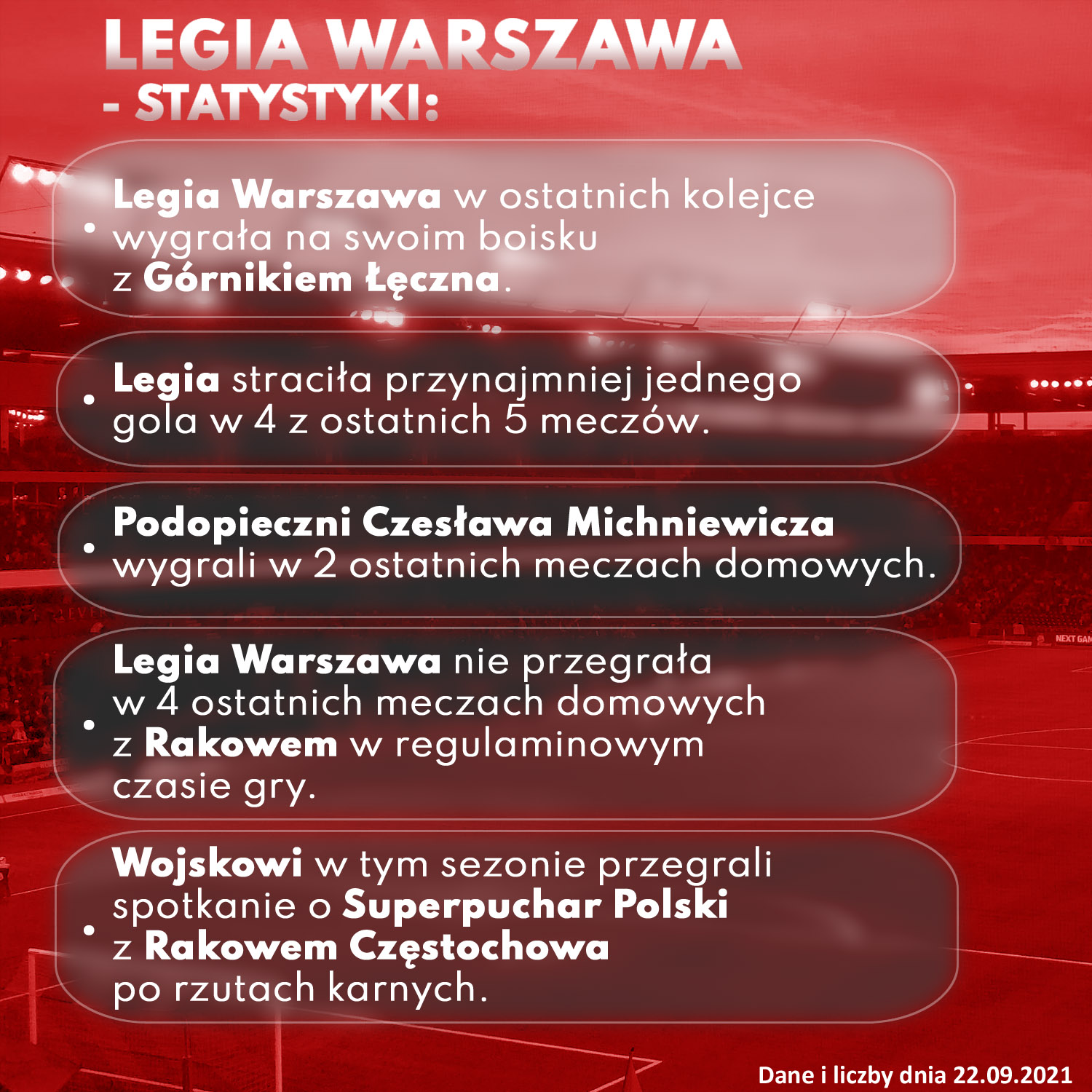 Legia Warszawa już raz w obecnej kampanii przegrała z Rakowem u siebie, jednak warto zwrócić uwagę na fakt, że było to starcie o Superpuchar Polski w którym zdecydowały rzuty karne. W regulaminowym czasie gry padł wynik 1:1. Łącznie oba zespoły spotkały się przy Łazienkowskiej 4 razy, z czego 3 zwycięstwa zaliczyła Legia i raz starcie skończyło się remisem i rzutami karnymi.