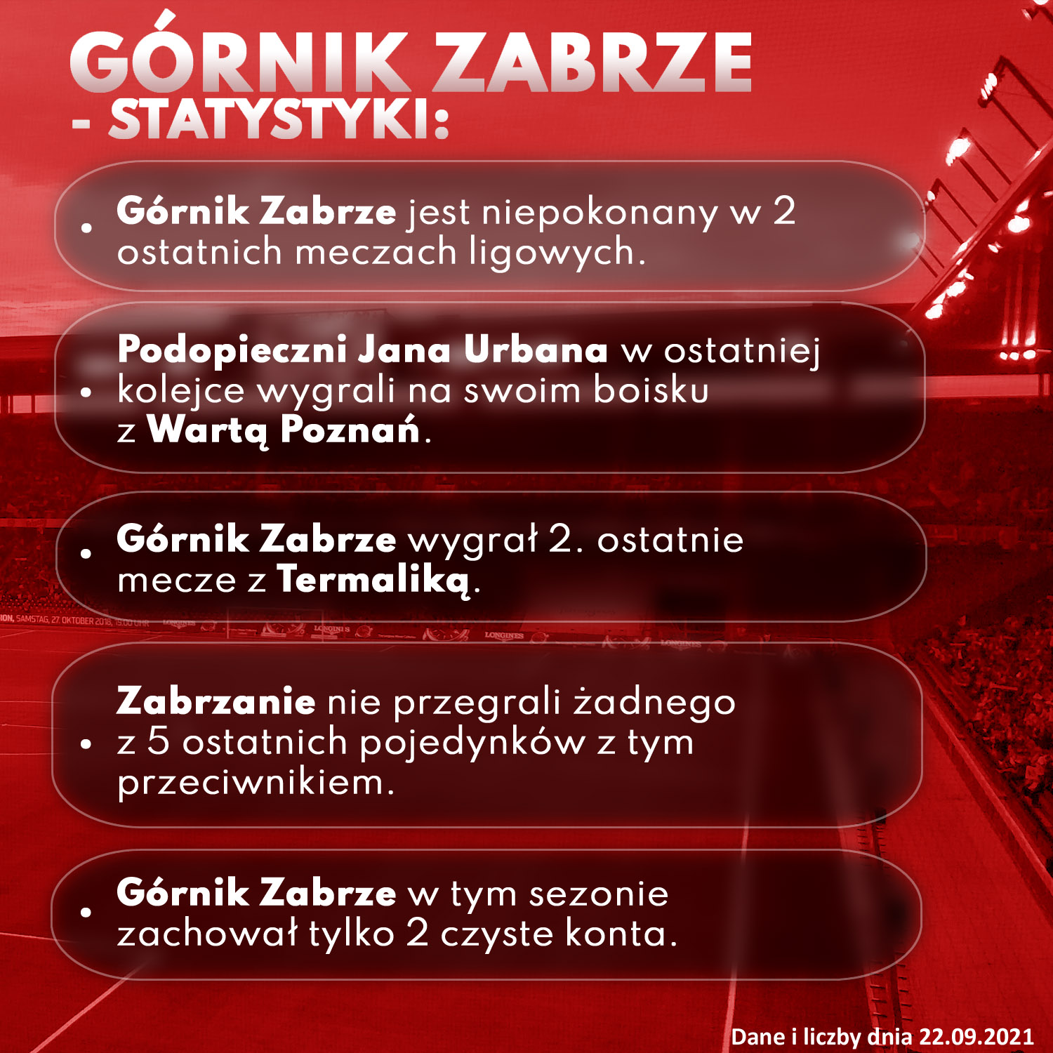 Trzeba jednak pamiętać, że Zabrzanie nie przegrali żadnego z 5 ostatnich pojedynków bezpośrednich z tym przeciwnikiem. Początek sezonu w wykonaniu Górnika nie należał do udanych, jednak trzeba przyznać, że w ostatnich tygodniach zanotowali zwyżkę formy. Podopieczni Jana Urbana w poprzedniej serii gier pokonali na swoim obiekcie Wartę Poznań. Aktualnie Górnik ma serię 2 kolejnych meczów bez przegranej na koncie.