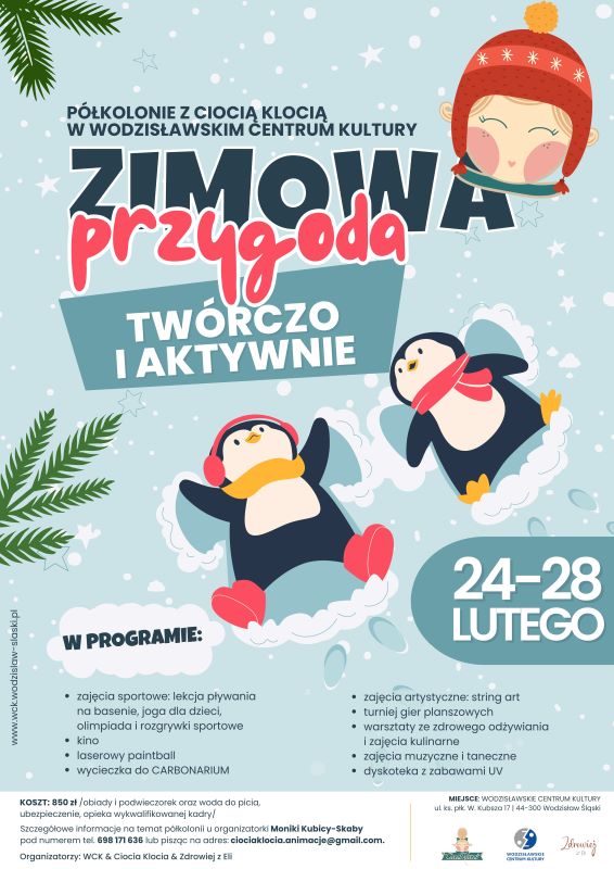 Ciekawe i rozwijające zajęcia podczas Akcji Zima? Wodzisławskie Centrum Kultury wraz z Ciocią Klocią zapraszają na półkolonie pn. „Zimowa przygoda – twórczo i aktywnie!”. Świetne warsztaty, kreatywne zajęcia, kino, wycieczka i wiele więcej będzie czekało na uczestników tego wydarzenia. Kiedy? Półkolonie odbędą się w terminie 24-28 lutego w godzinach 8:00-16:00.