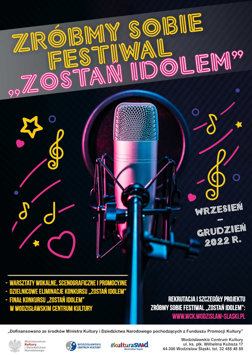 Na realizację projektu ZRÓBMY SOBIE FESTIWAL „Zostań idolem” Wodzisławskie Centrum Kultury otrzymało dofinansowanie z programu rządowego Edukacja kulturalna Ministerstwa Kultury i Dziedzictwa Narodowego.
