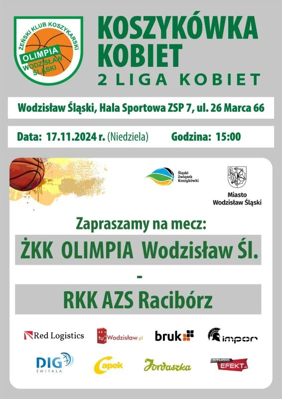 Żeński Klub Koszykarski Olimpia Wodzisław Śląski zaprasza na kolejny mecz 2. ligi koszykówki kobiet. Olimpia rozegra spotkanie z RKK AZS Racibórz. To doskonała okazja, aby zobaczyć nasze koszykarki w akcji. Możecie też liczyć na ogrom pozytywnych, sportowych wrażeń. Będzie się działo.
