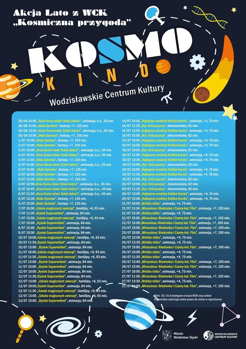 - godz. 10:00-11:30 - „Wakacyjne konstelacje” - zajęcia z Wodzisławskim Uniwersytetem Trzeciego Wieku, bilet: 12 zł, obowiązują zapisy, wiek 6-12 lat /WCK/
