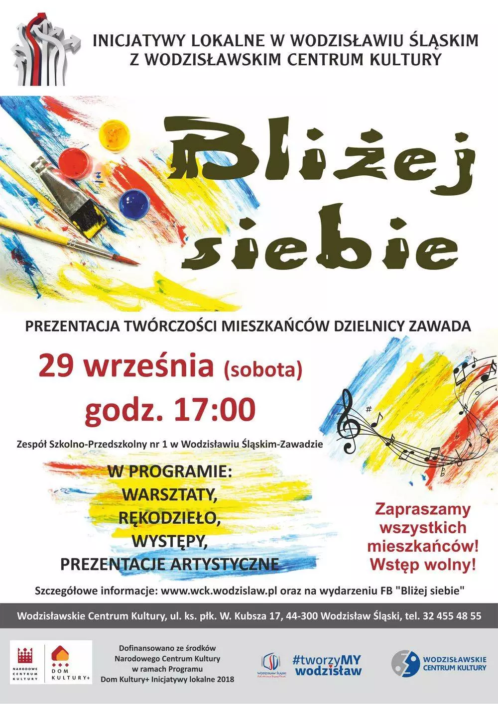 W ramach konkursu „Inicjatywy lokalne w Wodzisławiu Śląskim” 29 września o godz. 17:00 w dzielnicy Zawada, w Zespole Szkolno-Przedszkolnym nr 1 odbędzie się impreza środowiskowa „Bliżej siebie”, na którą organizatorzy zapraszają wszystkich mieszkańców naszego miasta.