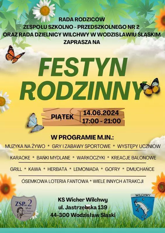- godz. 17:00-21:00 - Festyn Rodzinny - w programie: muzyka na żywo, gry i zabawy sportowe, występy uczniów, karaoke, kreacje balanowe, loteria fantowa, strefa gastronomiczna, organizatorzy: m.in. Rada Rodziców ZSP nr 2, Rada Dzielnicy Wilchwy, ZSP nr 2 /boisko KS Wicher Wilchwy, ul. Jastrzębska 139/