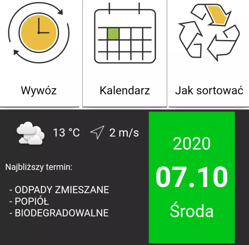 Aplikacja dostarcza danych m.in. w zakresie: terminów odbioru odpadów komunalnych z nieruchomości, adresu, dni i godzin otwarcia PSZOK, zasad prowadzenia selektywnej zbiórki odpadów, wysokości i terminów opłat za gospodarowanie odpadami komunalnymi, jakości powietrza czy aptek, w których możemy oddać przeterminowane leki. Aplikacja daje możliwość ustawienia alarmu przypominającego o terminach wywozu odpadów oraz wysyłania reklamacji związanych z brakiem odbioru odpadów - poprzez SMS lub zgłoszenie online. Uczy ponadto poprzez zabawę zasad segregacji śmieci, a dokładniej poprzez gry Akcja Segregacja i Sortowniś.