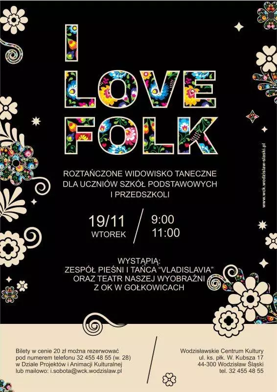 „I love folk" to najnowsza propozycja koncertu, który bawi, uczy i rozbudza zainteresowania dotyczące kultury ludowej. Publiczność dowie się m.in. czym charakteryzują się tańce spiskie, żywieckie, opolskie, a czym cieszyńskie, jak prawidłowo nosić strój śląski i czy „klepany" jest trudny. A wszystko to podane w ciekawej i humorystycznej oprawie. Taniec, śpiew, zabawa, czyli folklor, w którym można się zakochać. Koncert będzie tłumaczony na język migowy.