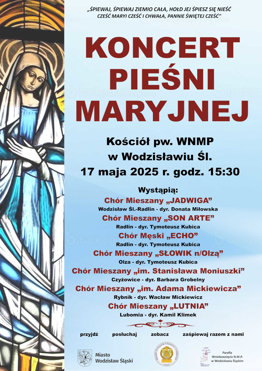W sobotę, 17 maja, o godzinie 15:30 w parafii Wniebowzięcia Najświętszej Maryi Panny w Wodzisławiu Śląskim odbędzie się wyjątkowy Koncert Pieśni Maryjnej. Wydarzenie zgromadzi siedem chórów, które zaprezentują piękno muzyki sakralnej w duchu modlitwy.