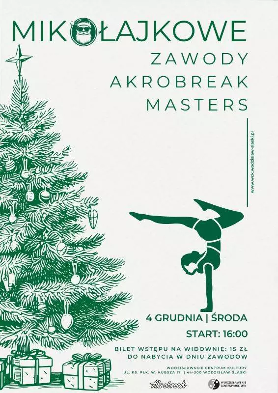 Wodzisławskie Centrum Kultury zaprasza na wewnętrzne Mikołajkowe Zawody zespołu Akrobreak, które odbędą się 4 grudnia w środę o godz. 16:00. Podczas imprezy zaprezentują się członkowie sekcji akrobatyki tanecznej pn. Akrobreak działającej w ramach Amatorskiego Ruchu Artystycznego w WCK.