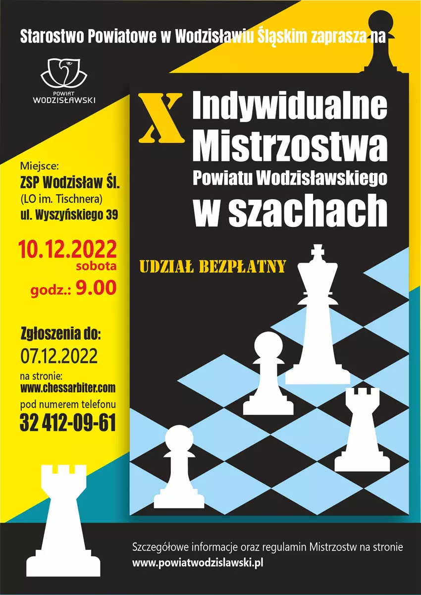 X Indywidualne Mistrzostwa Powiatu Wodzisławskiego w Szachach, organizowane przez powiat wodzisławski, odbędą się ZSP w Wodzisław Śląskim (LO im. Tischnera) w sobotę, 10 grudnia o godz. 9:00.