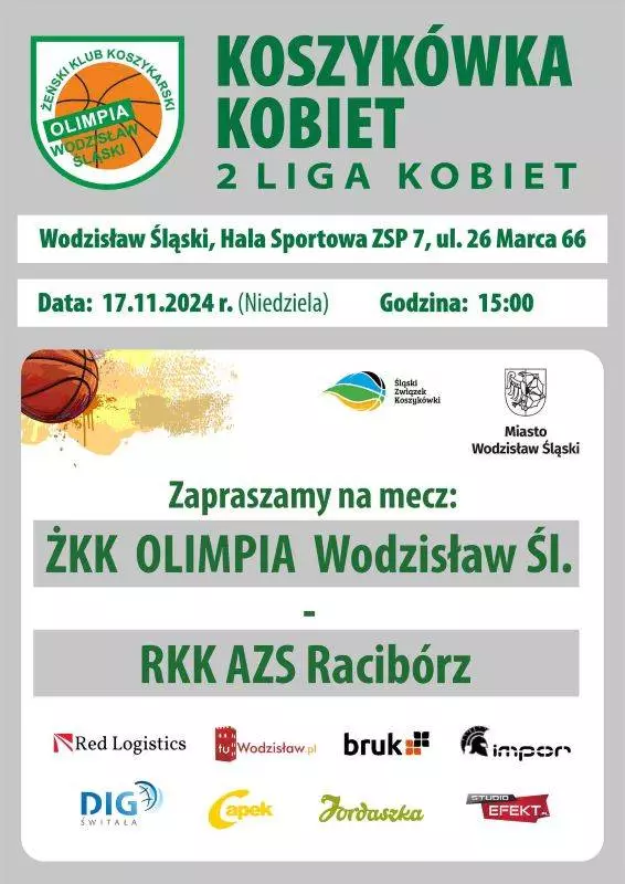 - Żeński Klub Koszykarski Olimpia Wodzisław Śląski zaprasza na kolejny mecz 2. ligi koszykówki kobiet. Olimpia rozegra spotkanie z RKK AZS Racibórz. To doskonała okazja, aby zobaczyć nasze koszykarki w akcji. Możecie też liczyć na ogrom pozytywnych, sportowych wrażeń. Będzie się działo.