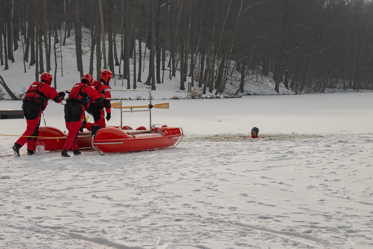 Pamiętajmy, że każde wejście na zamarznięty zbiornik wodny jest ryzykowne, nawet przy bardzo dużym mrozie. Lód ulega ciągłym zmianom, również dobowym i nigdy nie ma tej samej grubości na całej powierzchni. Poruszanie się po lodzie bez odpowiedniej wiedzy i sprzętu asekuracyjnego może zakończyć się tragicznie.