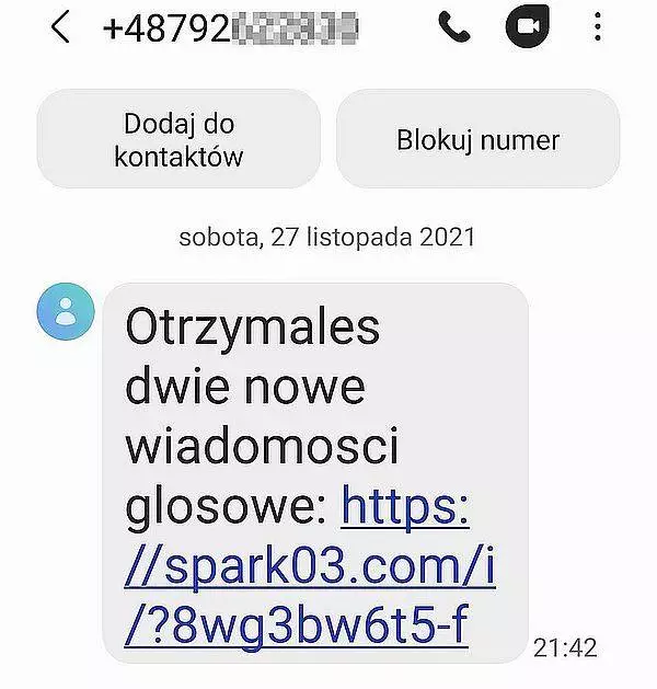 To dość nowa metoda. Przestępcy podszywają się pod operatora telekomunikacyjnego, wysyłają wiadomość sms z informacją o nagranej wiadomości głosowej. W wiadomości odczytamy, że aby ją odsłuchać, wystarczy kliknąć załączony link. Ta czynność spowoduje ściągnięcie na telefon złośliwego oprogramowania, za pomocą którego przestępcy wyprowadza pieniądze z naszego rachunku bankowego. Dodatkowo mając do niego dostęp, mogą zaciągnąć kredyty. Numer, z którego przychodzą wiadomości należy najczęściej do osoby, która nie wie o tym, że posłużyli się nim przestępcy.