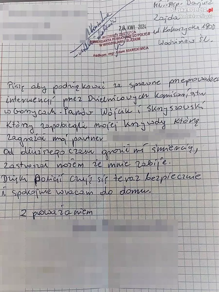 Dzielnicowi interweniowali w związku ze zgłoszeniem stosowania przemocy domowej oraz kierowania gróźb karalnych przez partnera kobiety. Policjanci zatrzymali wówczas agresora, który na wniosek śledczych oraz prokuratora został tymczasowo aresztowany. Kobieta postanowiła pisemnie podziękować za wszystko gorzyckim mundurowym.