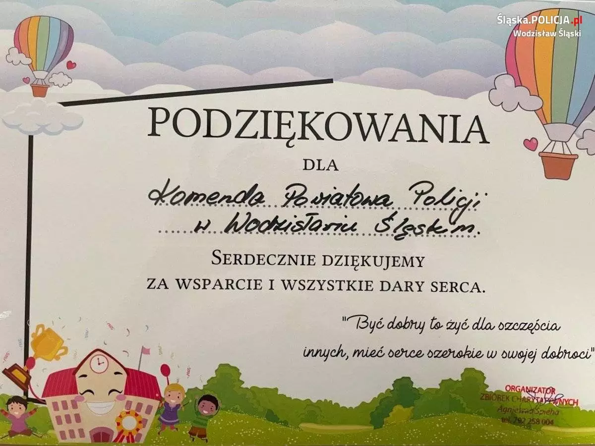Do Komendy Powiatowej Policji w Wodzisławiu Śląskim wpłynęły podziękowania od organizatorów zbiórki za okazaną pomoc.
