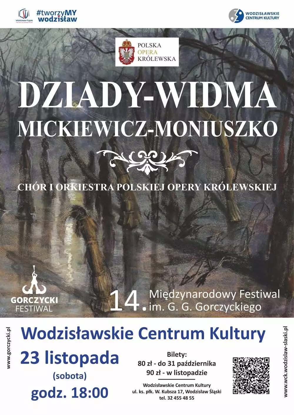 Bilety w cenie 80 zł w przedsprzedaży (do końca października) i 90 zł (listopad) są do nabycia w kasie WCK oraz za pośrednictwem strony biletyna.pl pod adresem: https://biletyna.pl/spektakl/Dziady-Widma-Polska-Opera-Krolewska-w-WCK/Wodzislaw-Slaski