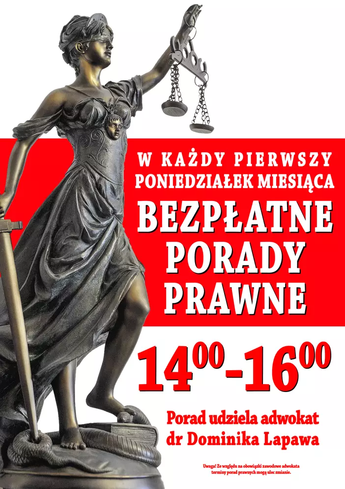 Porady udzielane są z każdej dziedziny prawa i nie obowiązują zapisy ani inne ograniczenia. Termin ten może ulec zmianie w związku z obowiązkami zawodowymi adwokata.