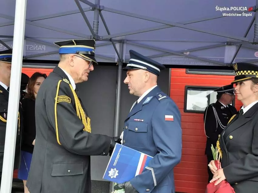 Na ręce Komendanta Powiatowego Państwowej Straży Pożarnej w Wodzisławiu Śląskim serdeczne życzenia złożył szef wodzisławskich policjantów. Pogratulował również Komendantowi otrzymanego wyróżnienia i awansu na wyższy stopień służbowy, podziękował za dotychczasową wzorową współpracę i życzył dalszego uznania w oczach mieszkańców.