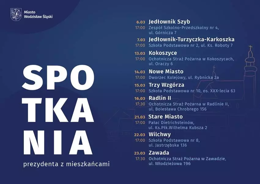 Włodarz wraz ze współpracownikami odpowie na pytania wodzisławian oraz odniesie się do ich sugestii. Zaplanowane na marzec spotkania będą doskonałą okazją do wyrażenia swojej opinii, podjęcia dialogu, wymiany doświadczeń oraz podsumowania i omówienia dotychczasowych działań.