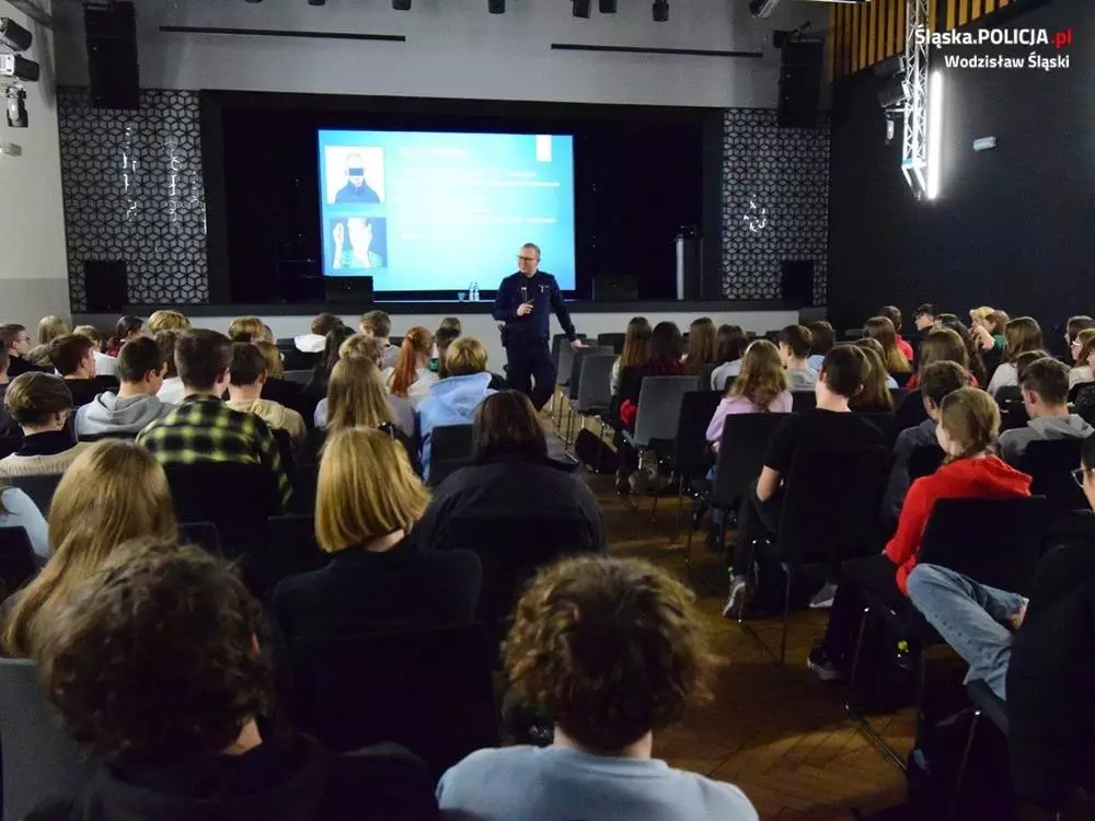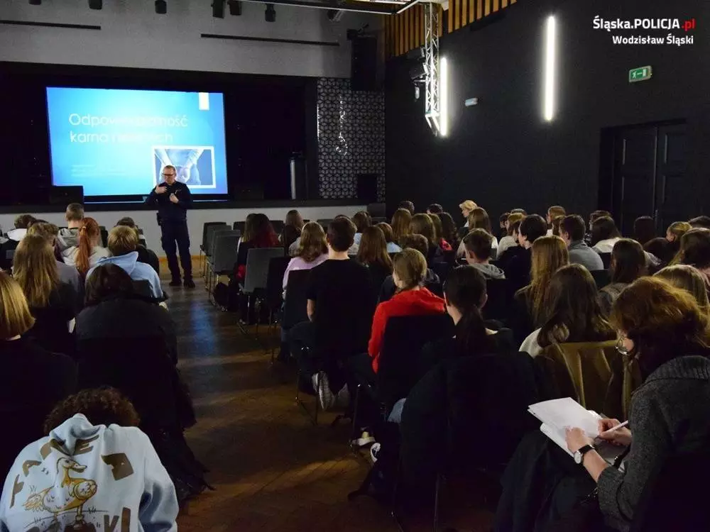W auli I Liceum Ogólnokształcącego w Wodzisławiu Śląskim, jak co roku odbył się dla uczniów pierwszych klas wykład. Policyjny profilaktyk, podkomisarz Patryk Błasik wyjaśnił ustawowe pojęcia demoralizacji i czynu karalnego. Omówił również zakres odpowiedzialności nieletnich za ich nieodpowiednie zachowanie, środki wychowawcze stosowane przez sądy rodzinne, a także nowe możliwości dyrektorów placówek oświatowych nadane im na mocy nowej Ustawy o wspieraniu i resocjalicji nieletnich.
