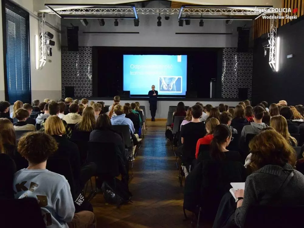 W auli I LO w Wodzisławiu Śląskim odbył się wykład dla uczniów klas pierwszych. Spotkanie przeprowadził policyjny profilaktyk, a tematem wykładu była odpowiedzialność prawna nieletnich. Wizyta w LO była okazją również do promocji służby w Policji.