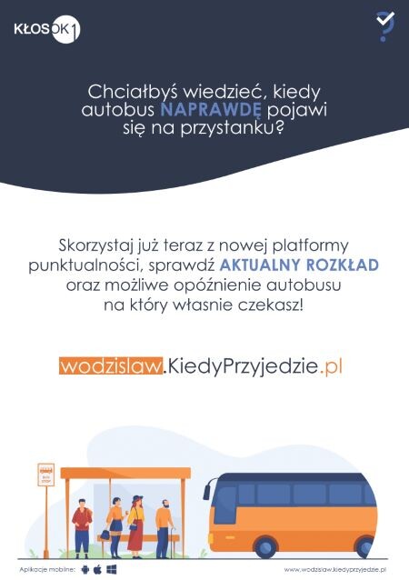 Pasażerowie komunikacji miejskiej w Wodzisławiu Śląskim mogą sprawdzić w swoim smartfonie lub na komputerze realny czas przyjazdu autobusów na wybrany przystanek. Aby to zrobić, wystarczy wejść na stronę internetową wodzislaw.kiedyprzyjedzie.pl lub pobrać aplikację KiedyPrzyjedzie.