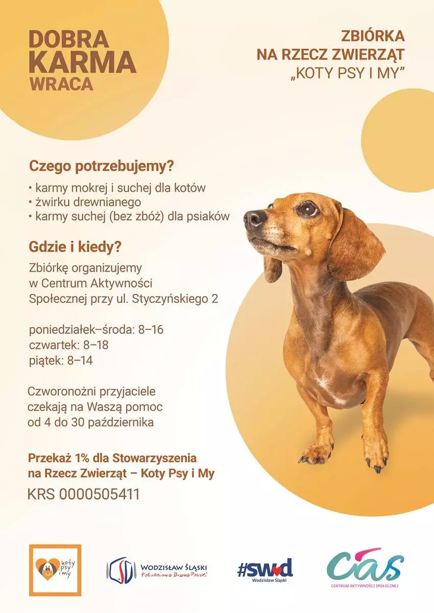 W październiku obchodzony jest Światowy Dzień Zwierząt. To doskonała okazja, by wspomóc wodzisławskie Stowarzyszenie Na Rzecz Zwierząt - Koty Psy i My. W tym celu Centrum Aktywności Społecznej w Wodzisławiu Śląskim uruchomiło zbiórkę karmy dla podopiecznych stowarzyszenia.