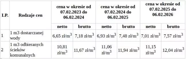 W tabeli przedstawiono wysokości cen za dostarczaną wodę i odprowadzane ścieki.