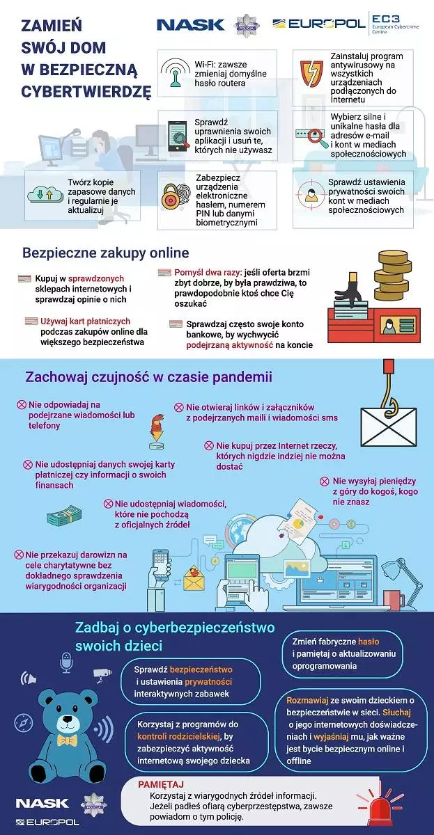 Biuro do Walki z Cyberprzestępczością KGP we współpracy z NASK (Naukową i Akademicką Siecią Komputerową) oraz Europolem przypominają o najważniejszych zasadach cyberbezpieczeństwa. #zostanwdomu to czas aktywnego korzystania z Internetu. Wiążą się z tym możliwości zdalnych zakupów czy kontaktu z bliskimi i znajomymi, ale to także przestrzeń aktywności oszustów.