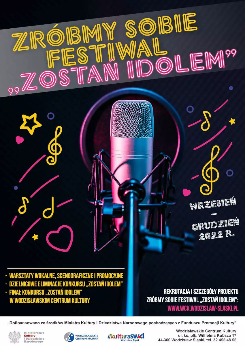 ZRÓBMY SOBIE FESTIWAL „Zostań idolem” to nowy projekt aktywizujący mieszkańców dzielnic Wodzisławia Śląskiego. Opracowany cykl interdyscyplinarnych warsztatów ma na celu integrację mieszkańców i przygotowanie ich do organizacji dzielnicowych eliminacji festiwalu wokalnego „Zostań idolem" oraz finalnie do konkursu laureatów w WCK.