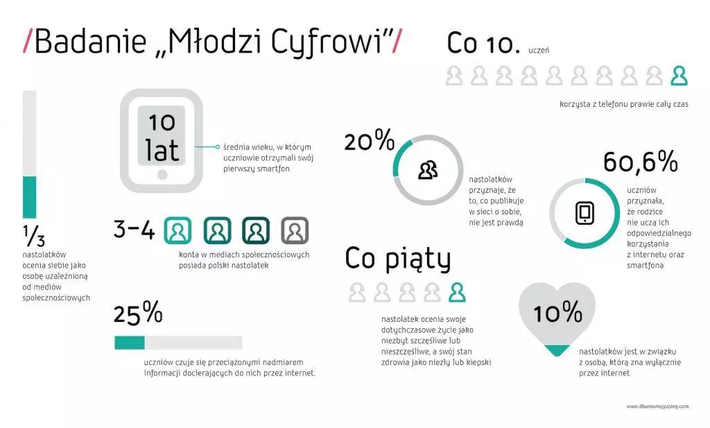 Niepokojące są również dane Uniwersytetu Gdańskiego i Fundacji Dbam o Mój Z@sięg, z których wynika, że co piąty uczeń nałogowo z niego korzysta. Niepokój, zdenerwowanie, problemy z koncentracją i uczucie przeciążenia nadmiarem informacji, przy jednoczesnym braku wystarczającego wsparcia ze strony rodziców – taki obraz polskich nastolatków wyłania się z badania „Młodzi Cyfrowi”.
