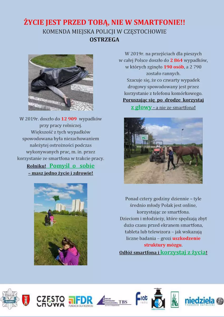 Komenda Miejska Policji w Częstochowie wspólnie z ZGM TBS w Częstochowie zainaugurowała kampanię społeczną "Życie jest przed Tobą, nie w smartfonie". Na briefingu prasowym zorganizowanym przez jej twórców obecna była zastępca Komendanta Miejskiego Policji w Częstochowie - nadkom. Grażyna Dudek, Prezydent Miasta Częstochowy - Krzysztof Matyjaszczyk, Prezes ZGM TBS w Częstochowie - Paweł Konieczny oraz partnerzy projektu, tj. Naczelnik Wydziału Zarządzania Kryzysowego Starostwa Powiatowego w Częstochowie - Anetta Ujma i Dyrektor Kasy Rolniczego Ubezpieczenia Społecznego w Częstochowie - Piotr Dobosz.